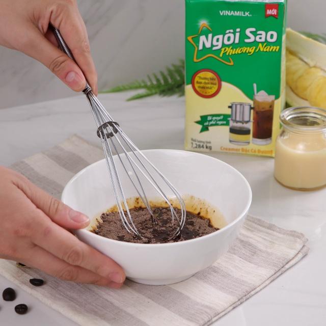 - Cho vào tô thủy tinh nhỏ 1 gói Cà phê Cappuccino Sầu Riêng, 16gr đường và 16gr nước nóng, khuấy đều cho hòa quyện.