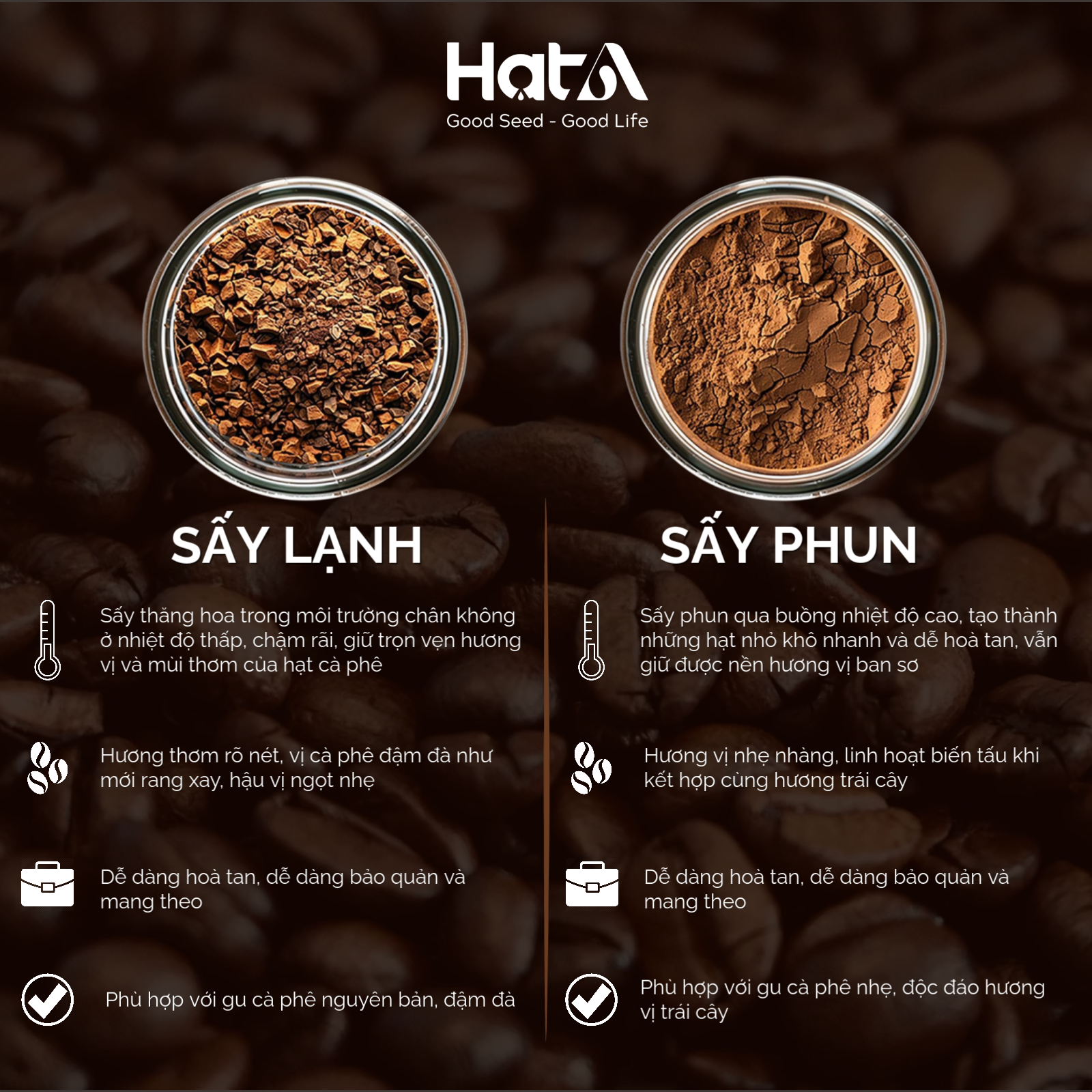 - Sấy lạnh: Giữ trọn hương vị nguyên bản, cho trải nghiệm như cà phê pha máy.